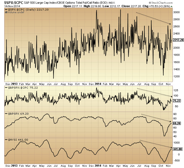 Either this is supremely bullish, like previous major lows, or something else is going on. It should be clear that we are not at a significant low like 2009 or 2011, and the October correction didn’t get close to a washout in sentiment or allocations like the other two lows shown, so how can we explain it? Look at the rising trend since the turn of 2013 which is when the mania began. I suggest this is hedging. Similar to the persistently high range in Skew that has been in place.
