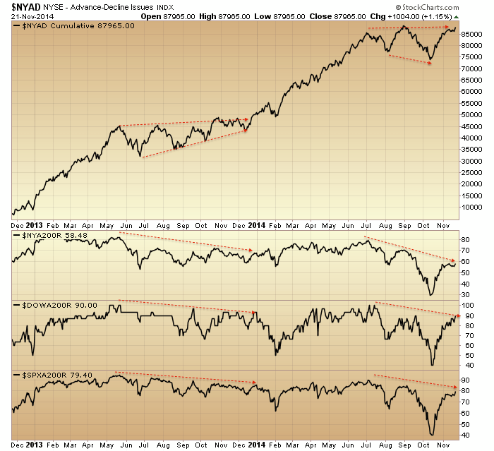 23nov5All year I have kept my worst-case scenario as a bull market top not occurring until the end of December 2014, and I still do. However, if equities were to keep rising from here for another 4 weeks, then I would expect the topping patterns in various indexes and the breadth divergences to be neutralised again. That would reset the topping process for a third time. I have great doubts that could occur but how/why might it?