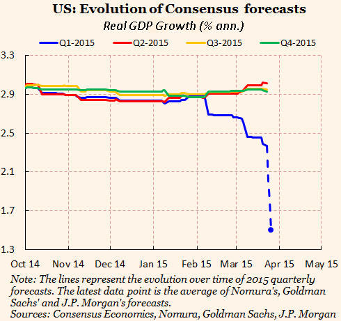 However, analysts are predicting both will improve as 2015 progresses. The first chart shows they have been downgrading Q1 GDP forecasts whilst slightly upgrading the next 3 quarters. The second chart shows they expect a significant recovery in earnings in H2 2015: