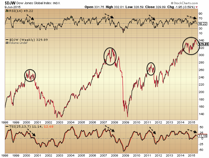 But it didn’t happen. Stocks were somehow saved. However, as pre previous posts, we see a lot of degradation in internals and cross-referenced data since mid last year, giving the potential for price action since then to be ‘last-gasps’. Below is the Dow Jones World stock index which reveals a similar higher high against weakening strength to the last 3 previous major tops.
