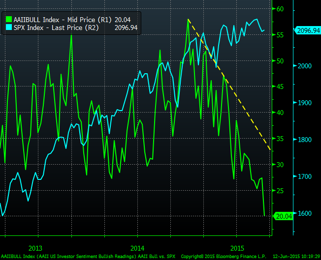 16junn4AAII bulls have also been making a divergence. Oddly though they have now reached the same level as March 2009, so that could be contrarian bullish. I’d just repeat that AAII sentiment survey has a poor predictive history hence I rarely post it.