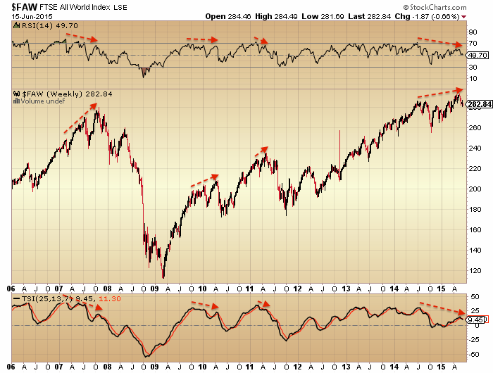 The global stock index has made a marginal new high since that point but the divergences in strength closely resemble previous major peaks.