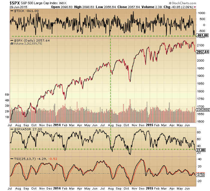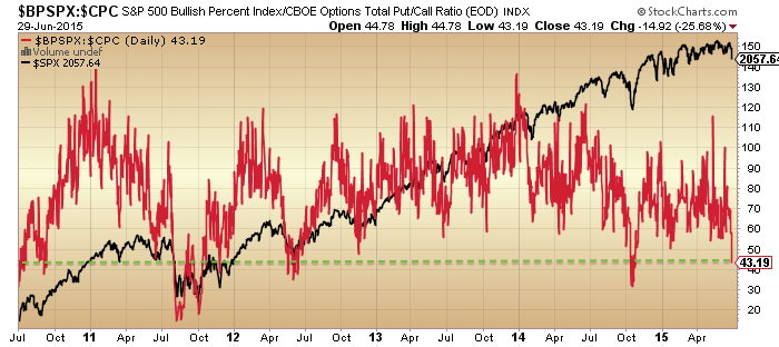 Next is bullish percent as a ratio to total put/call. I’ve previously highlighted the divergence in this indicator with the market since January 2014. However, because it has been in decline, yesterday’s selling took it to the kind of deep level associated with previous bottoms.