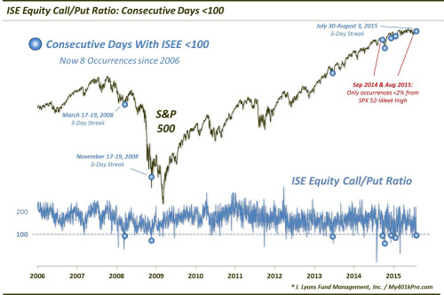 I understand put/call ratio, but other than the 2 dots in 2008, I do not think the other dots suggest a great buying opportunity. This is because markets post-2009 have gone up, and I could throw a dart and look right. (Again, I cannot zoom in, and basing this on my old eyes.) The other issue is that we don’t even see one other solar cycle — i.e. what happened in 2000, and as we know, even fitting the last 3 solar cycles is insufficient sometimes. Another data source, CBOE Equity Put/Call, did hit a high of 1.4 in early July, but that was under the 1.6 last October, and moreover, 1 month has passed since the high point. Finally, it appears that we have a data issue on the VIX yesterday because it only occurred for one tick (I checked the minute data.), but the VIX low was 10.88. If you choose to believe that data point, it suggests complacency.