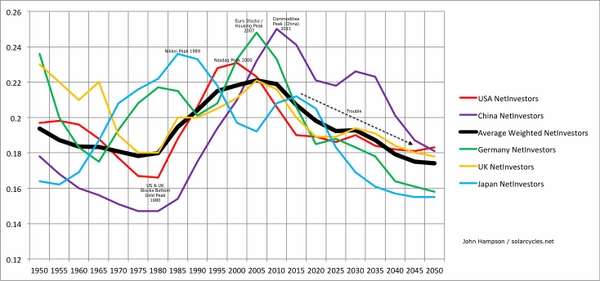 This chart shows the ratio of middle-aged to all population in the major nations. This ratio experienced a major peak in each of the countries between 1989 and 2011 producing the according stock market and commodity major peaks.