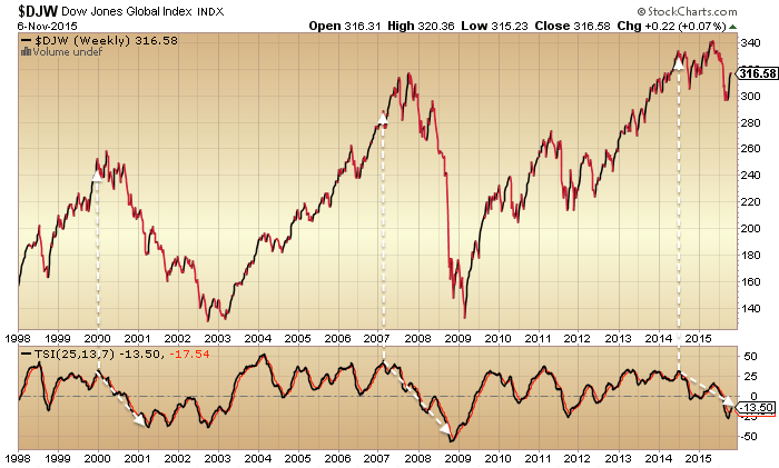 The Dow Jones World index appears to show a topping process that ended in May 2015. If that is so then we ought to be on the cusp of a new leg down.