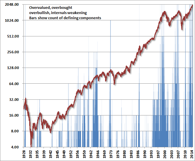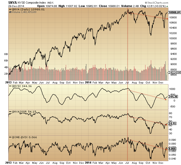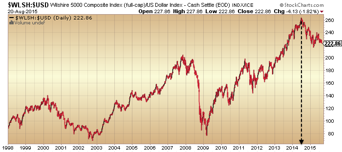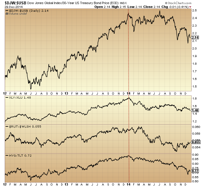 Stocks to bonds and stocks to dollar continue to show a peak in mid-2014, equivalent to Jan 2000 or June 2007 as a lead for a bear market.