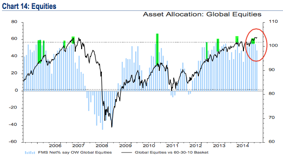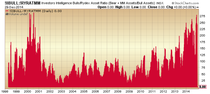 Here we see Rydex traders were at extreme allocations earlier this year equivalent to the 2000 mega peak, and how the recent rally has brought them back to fairly extreme levels.