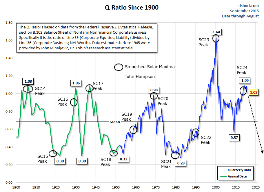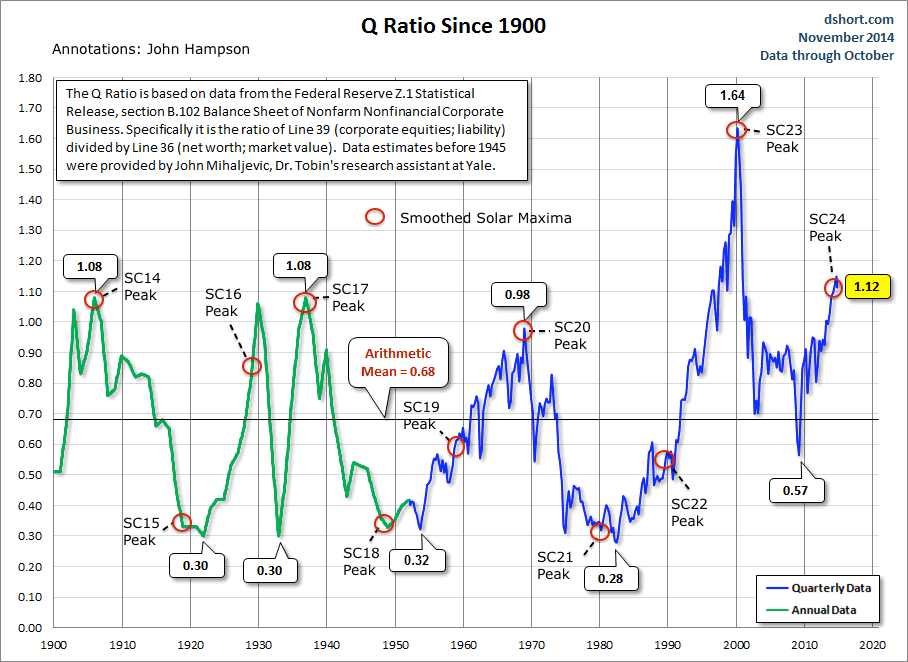 All those indicators that I previously pointed out as peaking mid 2014 with the solar max remain just so. Stocks:bonds, stocks:dollar, vix (inverted) and credit spreads can all be found further up the page showing a June-July 2014 peak which is still honoured. So, for now, the idea that the mania peaked out with the solar max still has a multi-indicator case.