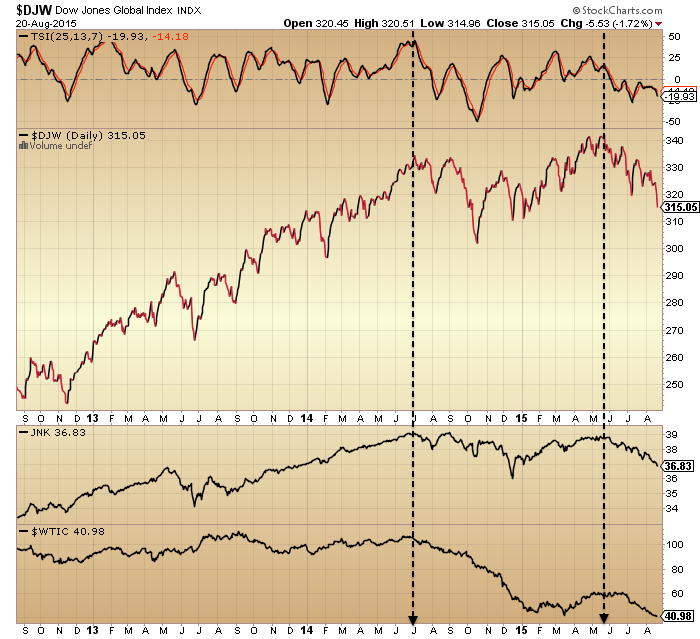 The Dow Jones World index appears to show a topping process that ended in May 2015. If that is so then we ought to be on the cusp of a new leg down.