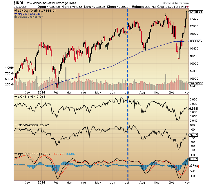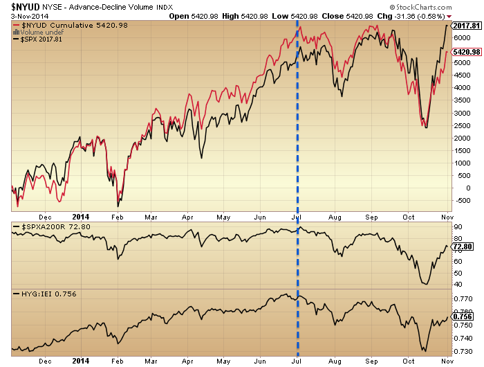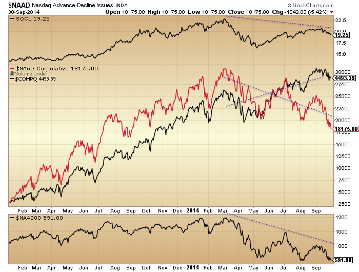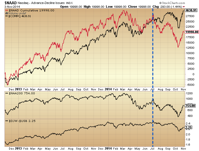 6. Whilst the NYSE, SP500 and Dow picture reveals breadth issues since the turn of July. We can also see there was an earlier bad-breadth run into the turn of 2014 which was subsequently repaired: like an attempt at a bull market peak but it wasn’t quite ready.