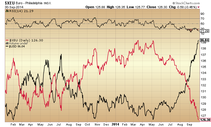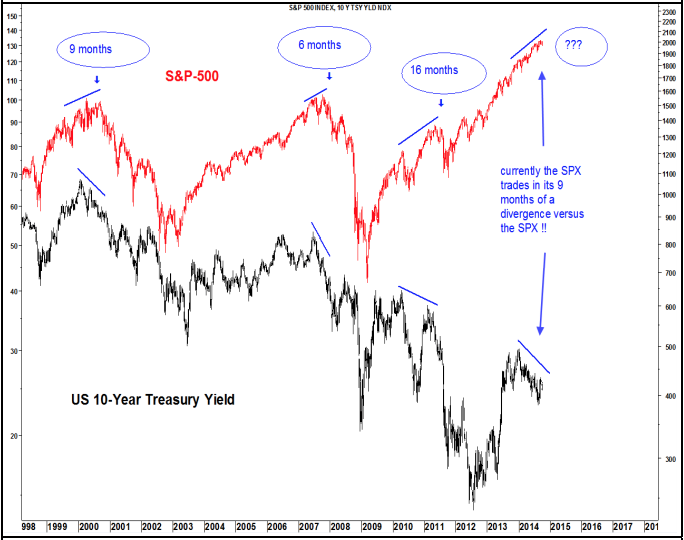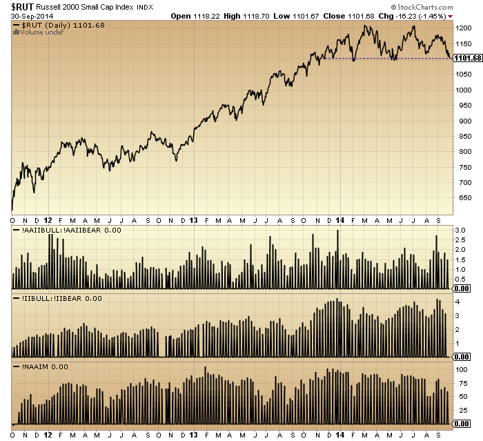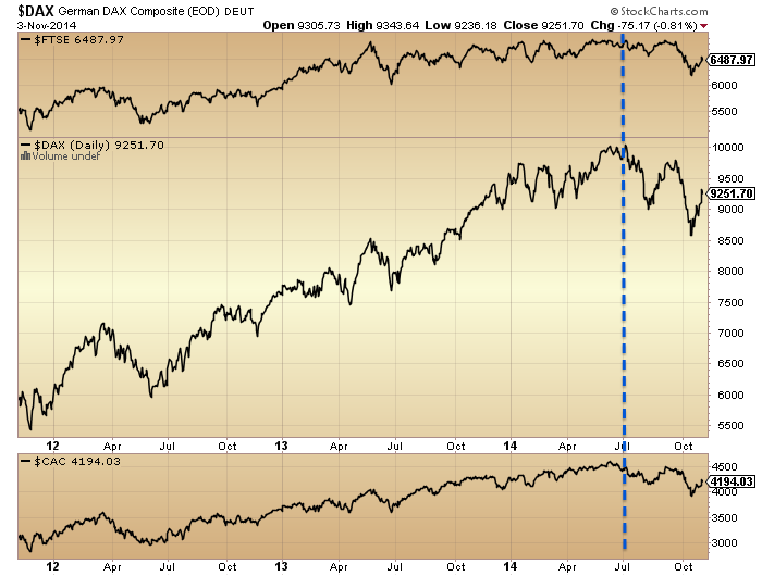 I believe the unprecedented extremes in levels and durations of price levitation, sentiment, allocations, leverage, tail-risk, and negative divergences mean a crash is coming. Like an elastic band stretched to the limit. The superficial 2014 bull trend in US large caps is nothing of the sort under the surface, but has served to fool most into a false sense of security. This last rally from October to November has sucked everyone in again (sentiment, allocations) and we have extreme lop-sidedness in the markets. I believe equities will tip over here and fall hard and fast, with no reprieve this time. No dragging on until year end: the megaphone formations on the US large caps are ripe for resolution now and overbought/overbullish indicators support this.