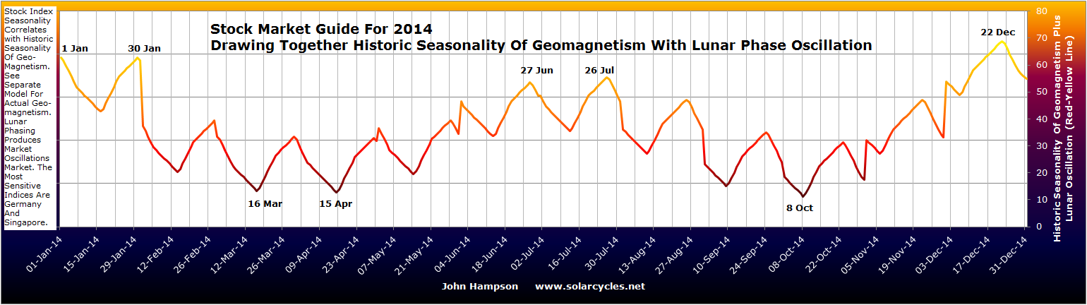 Homing in on the new moons of those two periods we get specific dates for a triple peak confluence of speculation/optimism: 1st January 2014 and 27th June 2014. I believe this is a compelling cross-reference for all the market charts above. We see multiple index and indicator peaks clustering at the very start of Jan and very start of July (both within two trading days of the new moon).