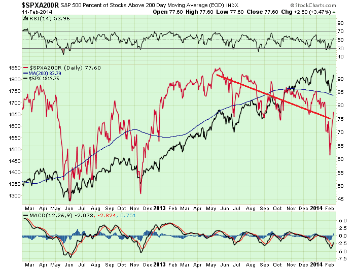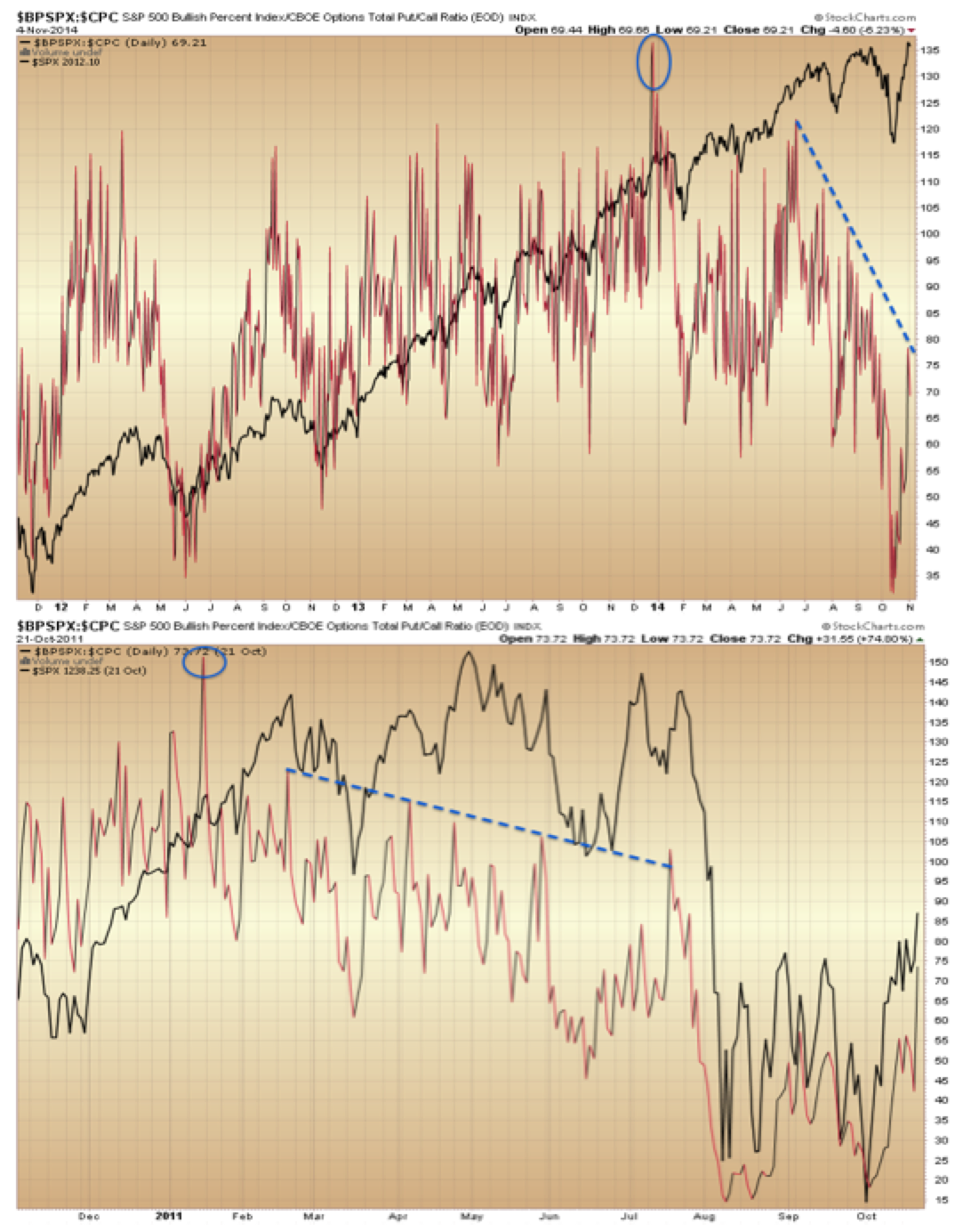 Bullish percent over put/call ratio is showing a five month divergence following a turn-of-year spike peak. The only mirror I can find for this is 2011, where something very similar occurred.