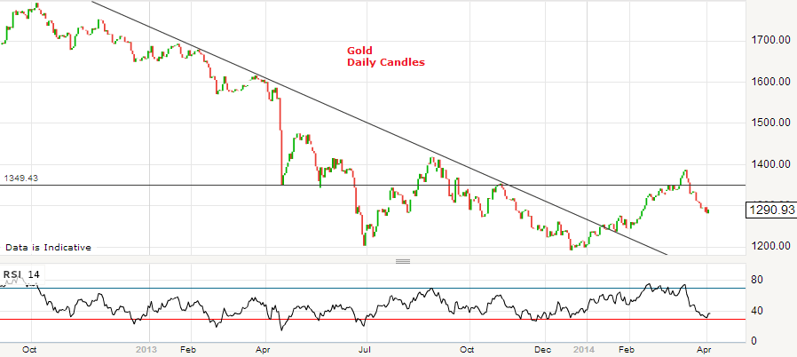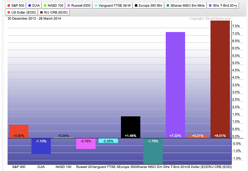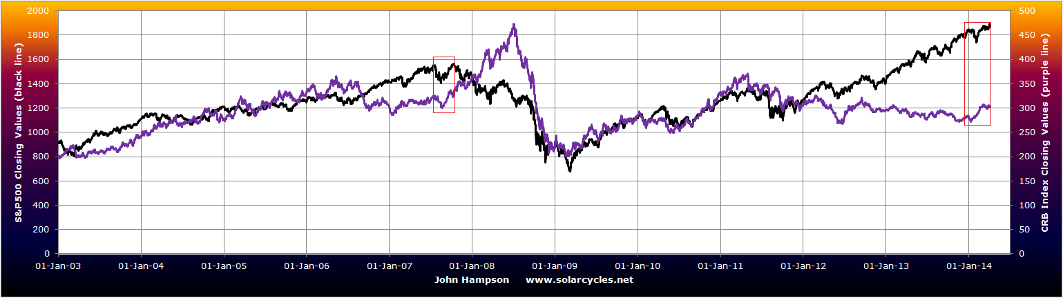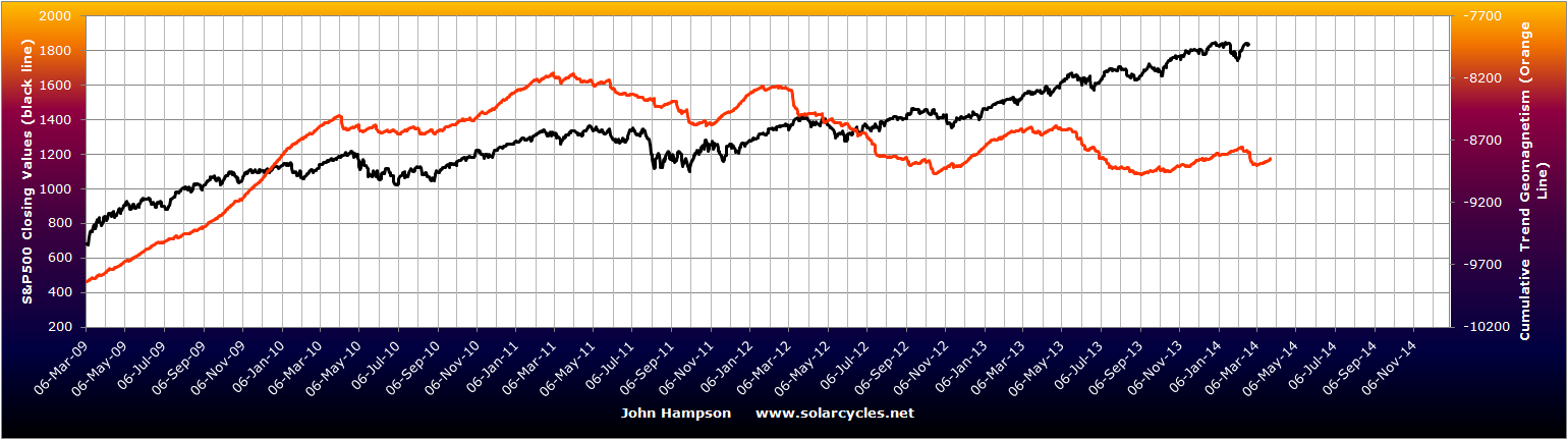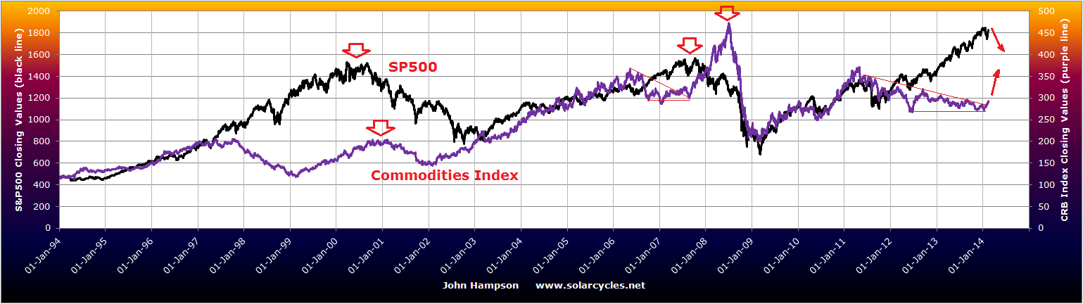 The primary scenario of a smoothed solar maximum having occurred in December 2013 and a highest monthly sunspot spike in Feb 2014 is supported by a chain of events to date: Bitcoin peaked in Dec, Nikkei and Dow (very tentative at the time of writing) peaked and money flows switched into defensives at the turn of the year, the ‘theme’ stock indices and sectors of the cyclical bull exuberance phase peaked out Feb-Mar 2014. But this is all subject to confirmation or invalidation. So let’s see how April develops. I remain significantly short equities, and siginificantly long precious metals, with other smaller positions long commodities. My worst case scenario is the continuation of speculation into late summer before Q3 falls in equties, and I would hold my positioning until then if so. But for now this is the outside scenario, and I maintain good odds of April delivering significant falls in equities, and momentum returning to gold with a higher low.