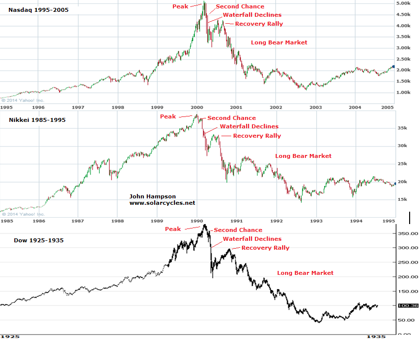 The lesser known reason for the big run up in price into the end of 2013 is the speculation peak driven by the solar maximum, and this was shared in the superpeaks of Dow 1929, Nikkei 1989 and Nasdaq 2000. A reminder that there are 3 ingredients for a superpeak: (1) speculative mania by solar maximum (2) increasing number of buyers through demographic swell and (3) increasing use of leverage amongst buyers. Both (1) and (3) apply to the current US markets but (2) is absent. There is a shrinking rather than swelling demographic pool, and for that reason we do not have a supersized peak. Otherwise, the analogies are very much applicable.