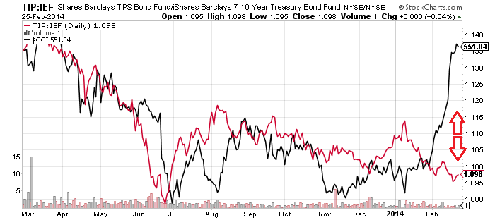 26fe107. Inflation expectations cast doubt on longevity of commodities (CCI index black line) rally: