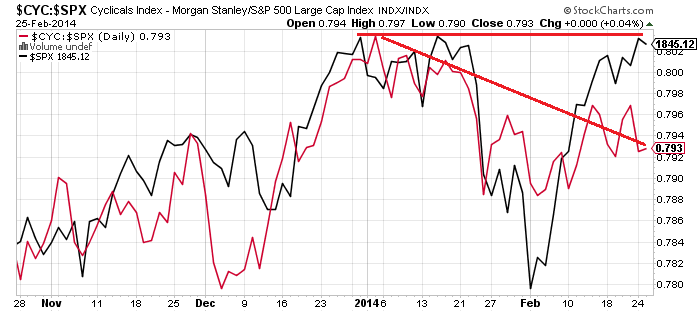Bullish percent to put/call ratio and cyclical sector to defensives ratios also show a telling divergence since we turned into November, suggesting the edging up in price over the last few days will be reversed.