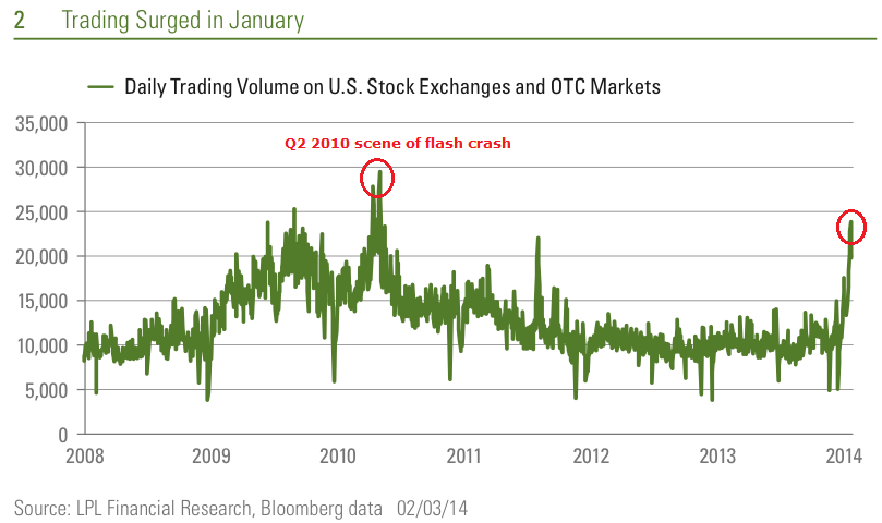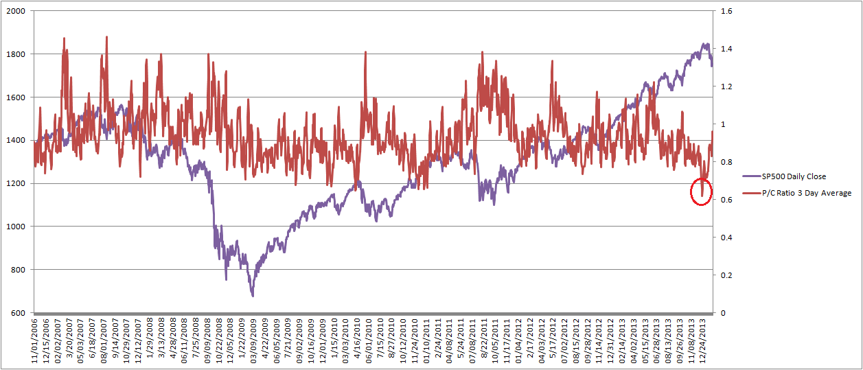 Complacent put/call went lower, Skew remains elevated, and defensive rather than cyclical sectors continue to lead in 2014: