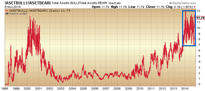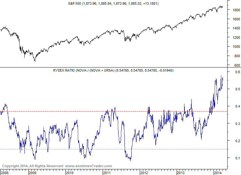 26fe89. Rydex bull ratio exceeds levels previously associated with significant corrections and 2013’s anomalous levitation raises risk of sharp collapse:
