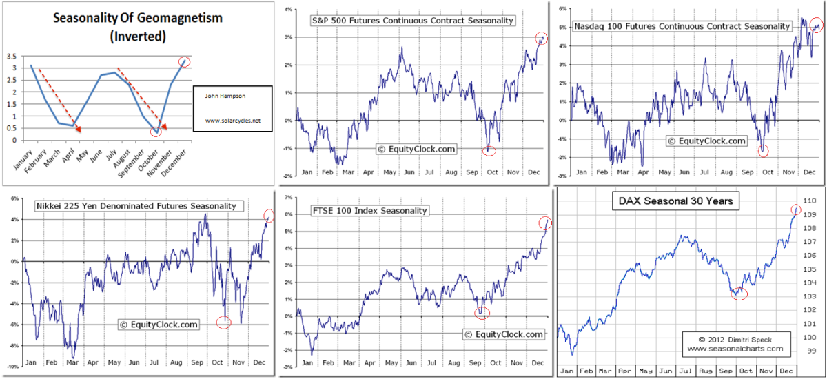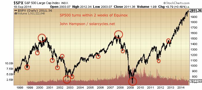 There is still a question mark over whether the smoothed solar maximum is definitely behind us, but the majority of solar models predict so. Therefore, as things stand, we have pretty good evidence of a speculative mania in the markets centred on a particular asset class or index topping out very close to the solar smoothed maximum, just like in 2000 (Nasdaq) and 1989 (Nikkei, 5 months after smoothed solar max) and 1980 (gold, 1 month after smoothed solar max).