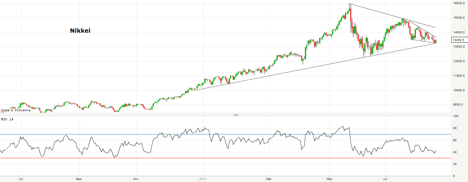 So is Japan a buy? Not all recent economic data has been supportive, but manufacturing and service PMIs are indeed in runs of positive growth, revealing underlying economic improvement. The Yen and Japanese bonds both dropped sharply following the launch of Abenomics but have since retraced some. However, the Yen now appears to have broken down out of a bear flag, whilst Japanese bond yields are shaping for a higher low and a potential push on from there. The Nikkei also consolidated following the big run up earlier in the year, but has now broken upwards out of two consolidation patterns shown: