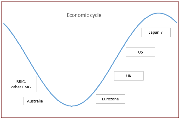 Which brings me to the two main threats to the economy and the equities cyclical bull: excessive inflation from sharp rises in commodity prices and/or excessive tightening from rising rates in escalating bond yields. Bond yields in the major economies continue to rise albeit from low levels. If economic growth persists further and the Fed begins to taper QE then we could expect yields to continue to rise. Historically, the tipping point has been when 10 year treasury yields hit 6%, however today’s demographic and debt interest pressures mean that trouble level is likely to be lower.