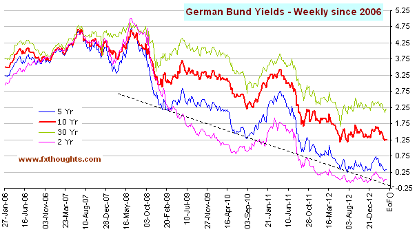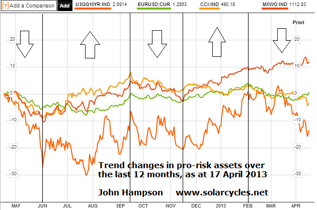 Collectively, these suggest the solar peak is more likely ahead in Fall 2013 than behind us in February 2012. I previously showed that world bond yield and money velocity charts could be bottoming out based on technical action thus far in 2012-2013, and in which case an escalation from here through the solar peak (assuming Fall 2013) would fit well with history. That would also suggest an inflation peak, and a secular commodities peak, lies ahead.