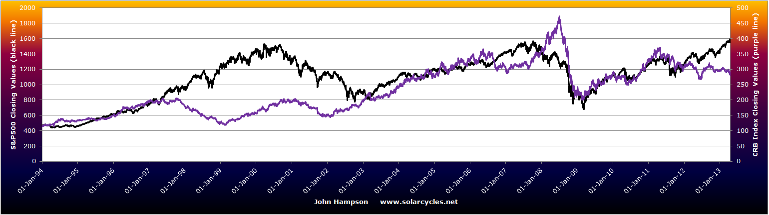 Thirdly, the commodities index long term, with solar maxima marked. Again, alternating secular bulls and bears, and again secular turns falling very close to solar maxima.