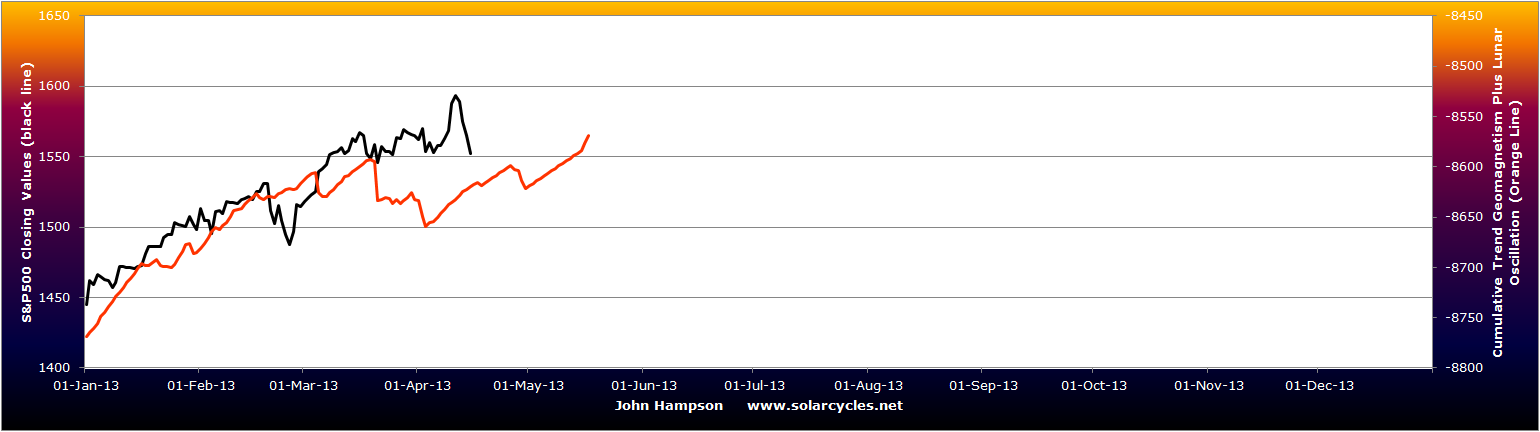 So by this modelling, we should be seeing a secular peak in commodities and a secular bottom in treasury yields around the current solar maximum, which should fall either Feb 2012 (past) or ahead in Fall 2013. Both commodities and treasuries have fulfilled secular bulls through to 2012/13, regardless of what happens next. The difficult part is in timing the turns when you are close in on the action, as we are as traders here in 2013. What is clear is that money velocity has not yet picked up and inflation has not peaked (making its high thus far in 2008). US jobs and yields spreads do not indicate a recession, and geomagnetism is currently benign. Jobs are in fact predicted to grow ino the Fall: