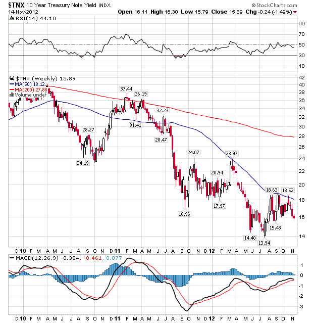 Meanwhile, the Nasdaq in the US is in a different place. Unlike the indices above, the Nasdaq reached far above its 2011 highs already, early in 2012. It since then rose above those 2012 highs (in March) to higher highs (in September) but has failed to hold above. The chart below shows that this could be meaningful.