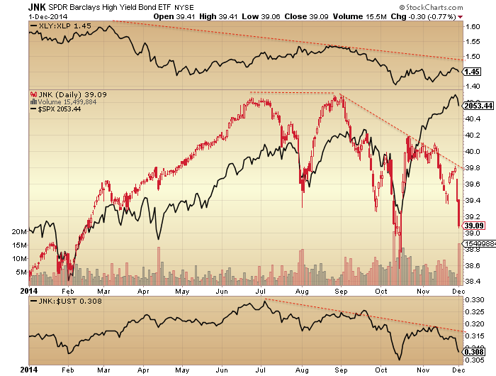 1. Primary shift to defensives and away from risk occurred as of January 2014, as measured by stocks to bonds, cyclical to defensive sectors, small caps to all caps and high yield to treasury bonds. Clock ticking from that point.