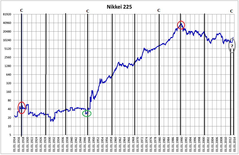 Firstly, the Japanese stock index long term chart, with solar cycle maximums marked as black lines (C for commodity secular peaks):