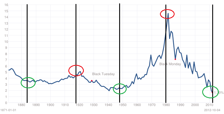 Fourthly, 10 year treasury yields long term chart, with every third solar maximum marked.