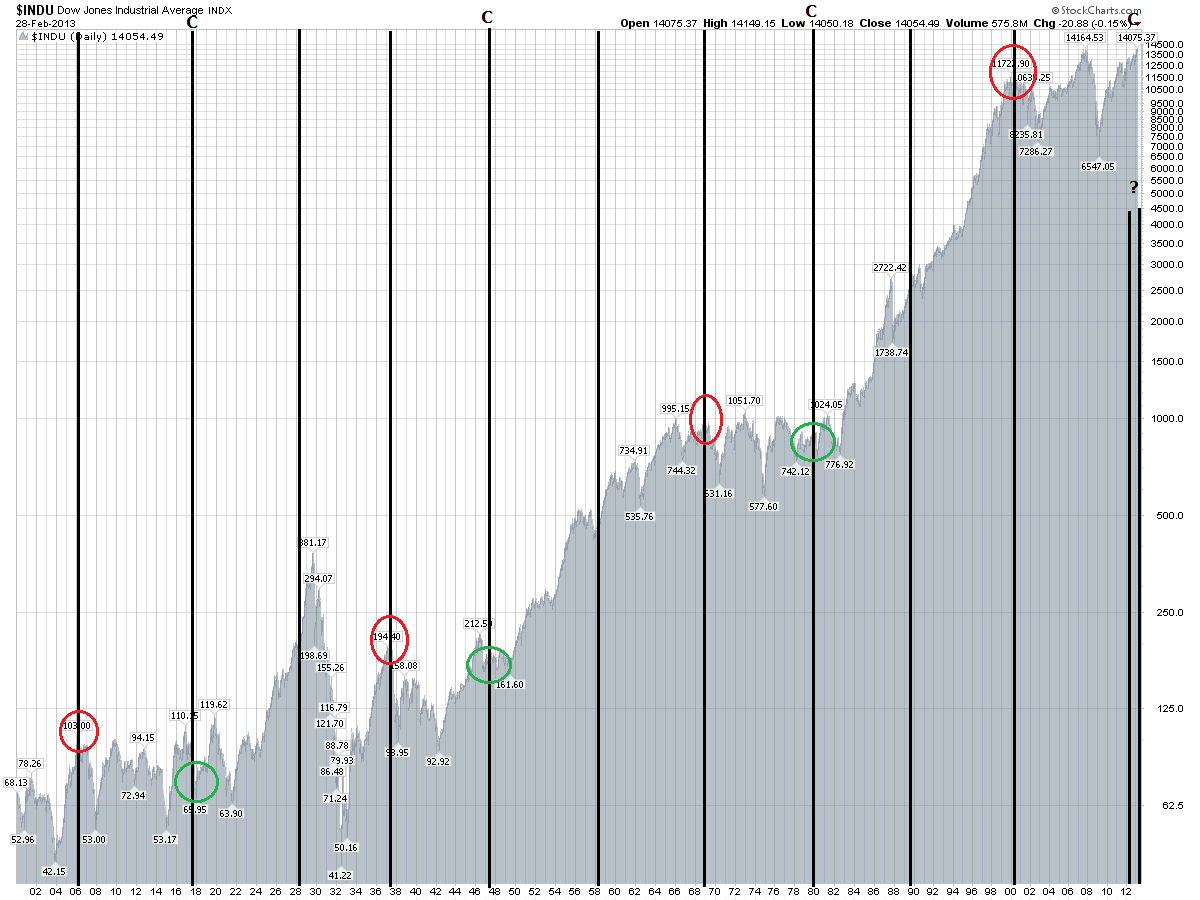A fairly simple 100 year history: a long secular bear followed by a long secular bull followed by a long secular bear that potentially just ended at the turn of 2012 into 2013. The secular turns fell very close to solar maxima.