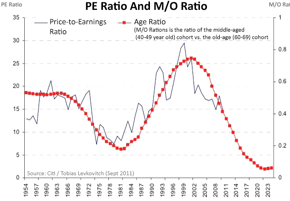 The next chart is a 100 year chart of the US Dow p/e ratio together with the trend in US demographics as measured by the middle-aged to young-aged ratio: