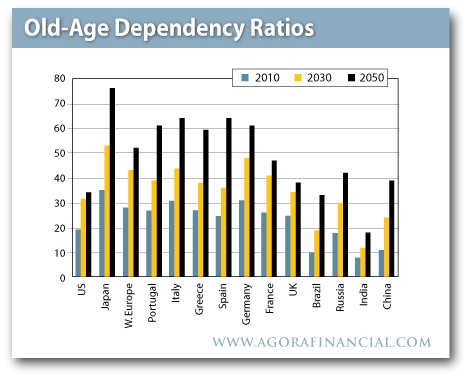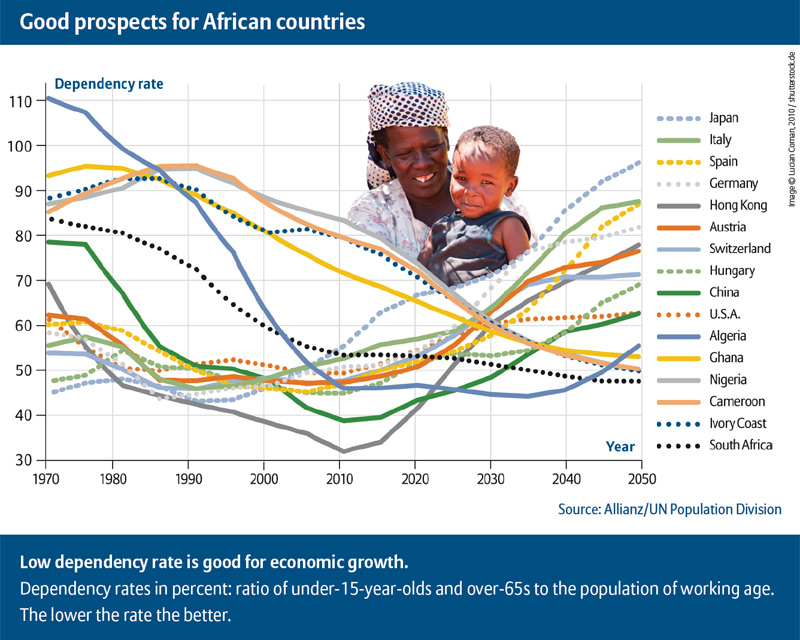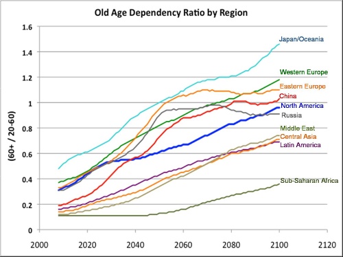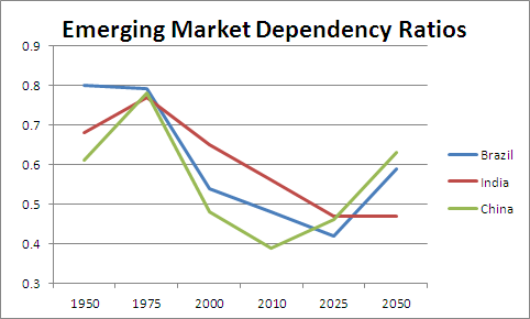 Let’s now look at dependency ratios (proportion of retired and young to the working population) demographics globally. Trends in the developed world contrast starkly with trends in emerging countries, as shown here: