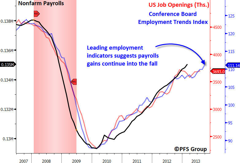 Historically, recessions have begun an average 14 months after solar peaks, so we might expect to see leading indicators for jobs falling by now if the solar peak passed in feb 2012.