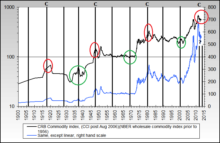 Collectively, these suggest the solar peak is more likely ahead in Fall 2013 than behind us in February 2012. I previously showed that world bond yield and money velocity charts could be bottoming out based on technical action thus far in 2012-2013, and in which case an escalation from here through the solar peak (assuming Fall 2013) would fit well with history. That would also suggest an inflation peak, and a secular commodities peak, lies ahead.