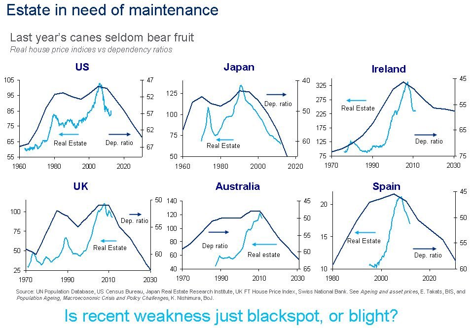 Back to demographics. The headwinds facing many developed countries in dependency trends are problematic. Here is real estate modelled against dependency for six developed nations: