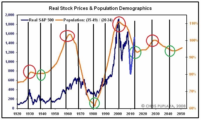 This chart is the same demographics trend shown against the inflation-adjusted Dow.