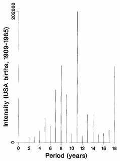Now things get interesting, because there appears to be a three-way relationship between solar maxima, demographics and equities, with peaks and troughs in all three lining up. In my Trading The Sun PDF I noted there was some research identifying solar cycling as influential in population and demographics in other species, as well as research attempting to correlate solar cycles with longevity and mortality in humans. But I have now additionally found a research paper by Walter Randall (1991) that identifies an 11-year cycle in human births, and here is the chart showing that dominant cycle in the US: