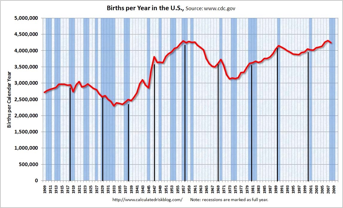 I have added the solar maxima to the US births per year chart below. We see births have typically spiked up a little at the solar peaks.