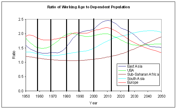 The countries with the best demographic trends looking forward include India, Brazil, Mexico, Indonesia and Philippines. South Asia, ASEAN and South America look particularly fruitful regions going forward, and Sub-Saharan Africa too. If this is a global transition into a K-Spring, then investments in equities and real estate (K-Spring’s champions) might do best in these countries and areas. The USA should perform well too, from 2020 to 2030, but the period before 2020 is less certain.