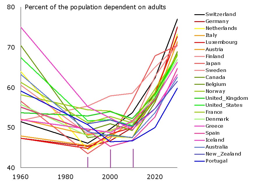 Brazil looks good. The USA improves looking out to mid-century. And the worst: Japan. So let’s return to Japan, which we can also model using the dependency ratio as below: