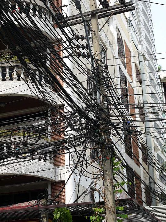 Well, Thailand didn’t measure up to Singapore, Malaysia and Bali. In Kuala Lumpur I was amazed at how friendly and laid back people were for a capital city, Bangkok was all round more ‘edgey’. In Bali journeys around the island were a sensory overload of both interest and beauty, whereas land travel through Thailand was more underwhelming. Overall, I found Thailand to be more scruffy than the other countries on my route so far (accepting it is a developing nation), and this would apply to both the natural and the man-made. Thailand was one of the fastest growing countries in the world in the 1980s and 90s but there have been some growing pains with such a rapid transformation. There is more of a crime issue than in the other countries I have so far visited and, to my eye, aesthetics have been rather overlooked in the country’s rapid development. One image that will remain in my mind is the jungle of telephone wires everywhere we went (see images below). A lot of these cables are put up illegally at night, until there are so many that some of the telephone poles start to lean over. I can only imagine that the spaghetti wiring is not considered an eyesore in Thailand, and maybe it isn’t to other travellers. But travel is a personal thing, and I found this to be a dominant ‘blot on the landscape’.